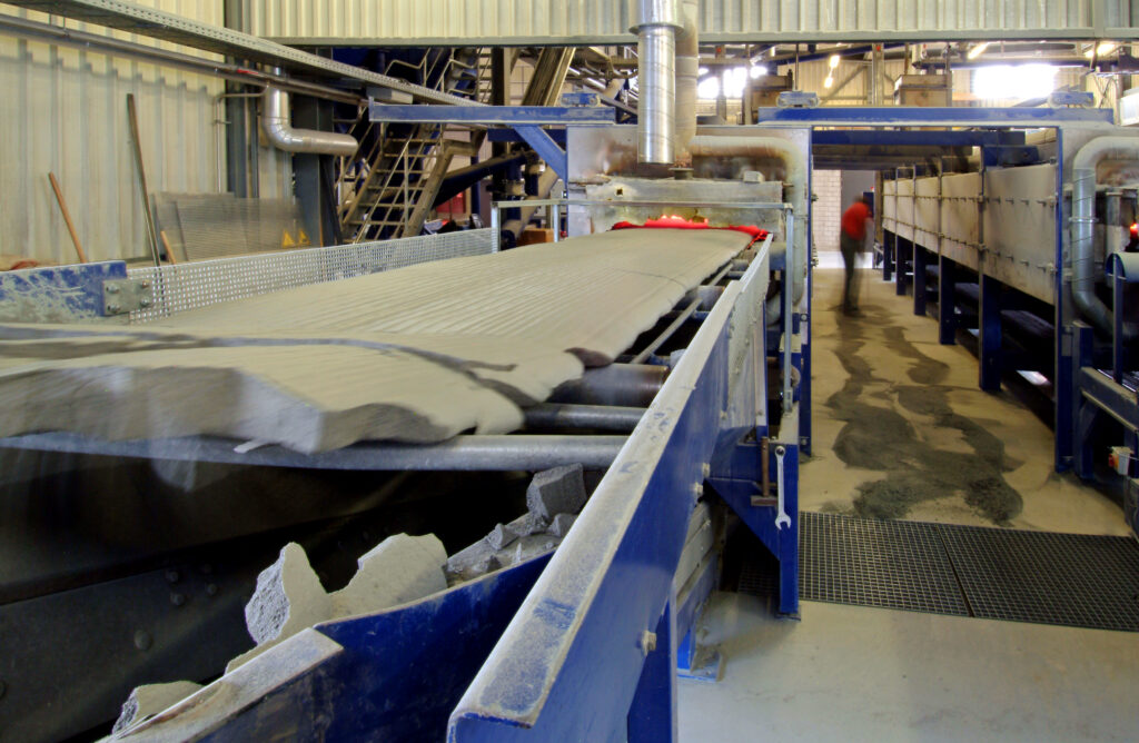 La farine de verre usagé gonfle dans un four pour atteindre sept fois son volume initial. Les propriétés essentielles du verre sont alors conservées. Le granulat de verre cellulaire MISAPOR présente une résistance élevée à la pression, est inerte et se distingue par sa faible densité apparente et ses bonnes valeurs d’isolation.